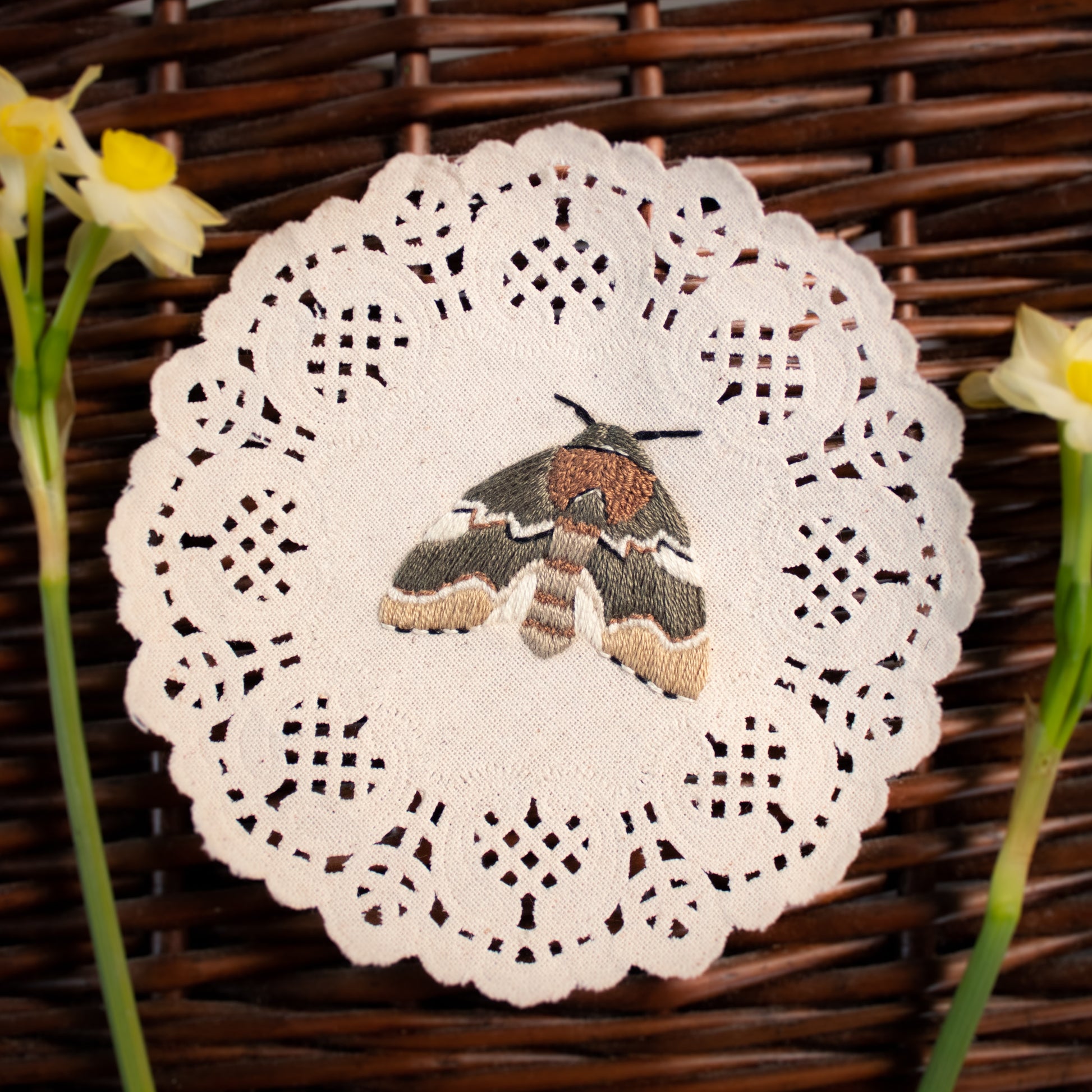 Pursue your love for entomology with this hand embroidered moth on a delicate doily. A great conversation piece and a lovely way to add a tiny bit of nature to your home.