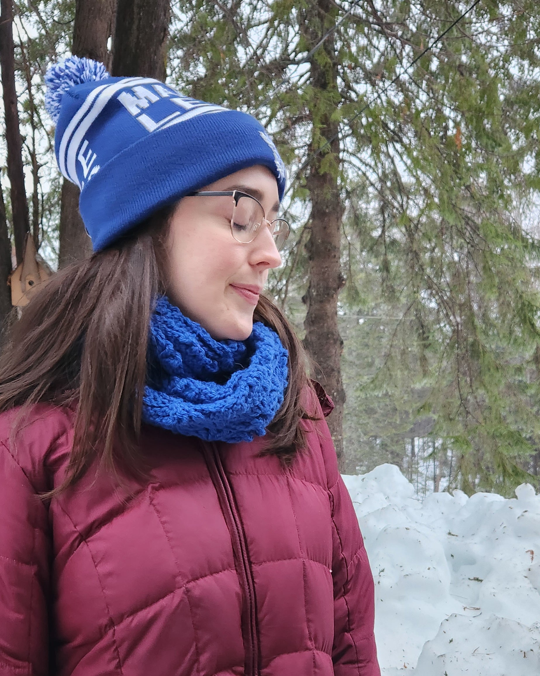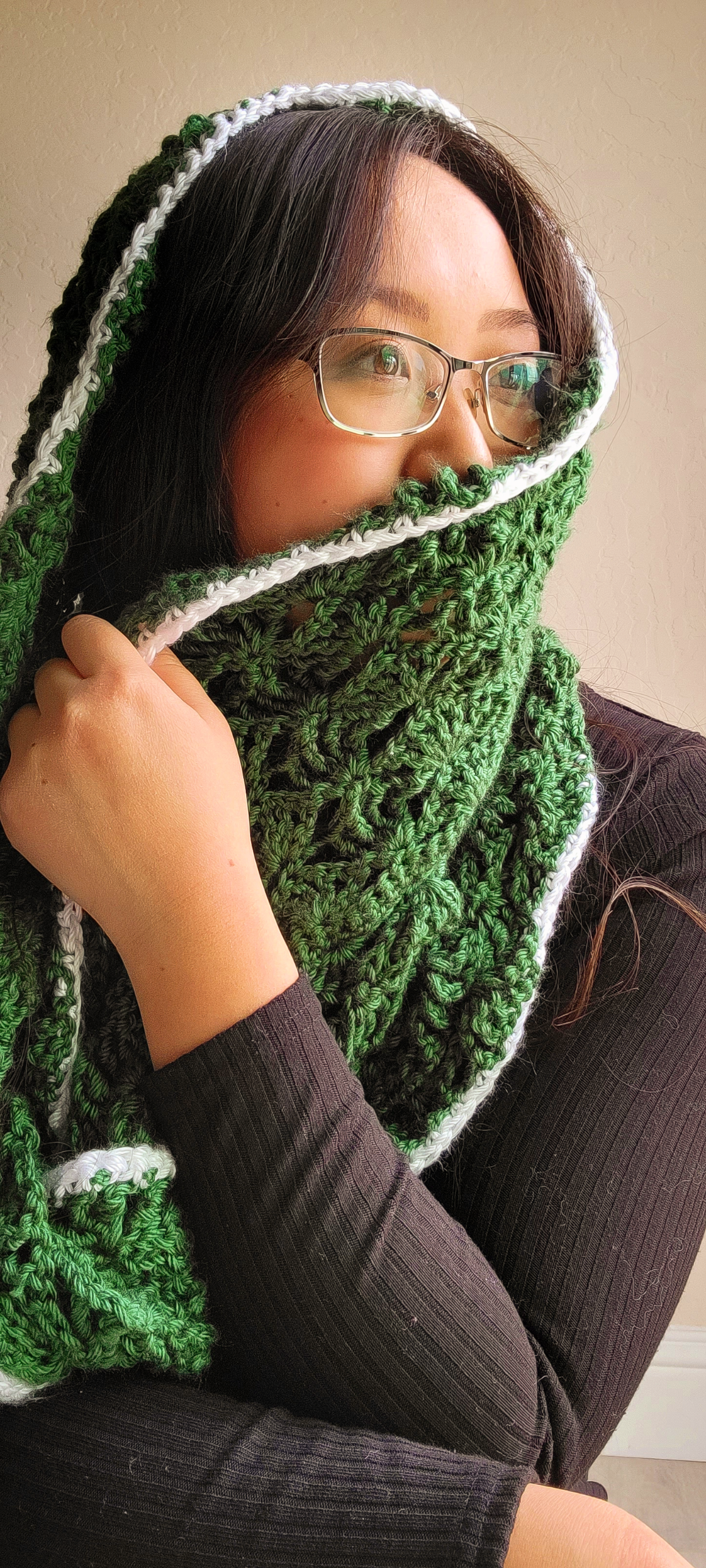 To keep the cold off your neck, wear it as an infinity scarf. If you forgot your hat you can wear it as a balaclava with a convenient space in the back to allow your hair or ponytail through.